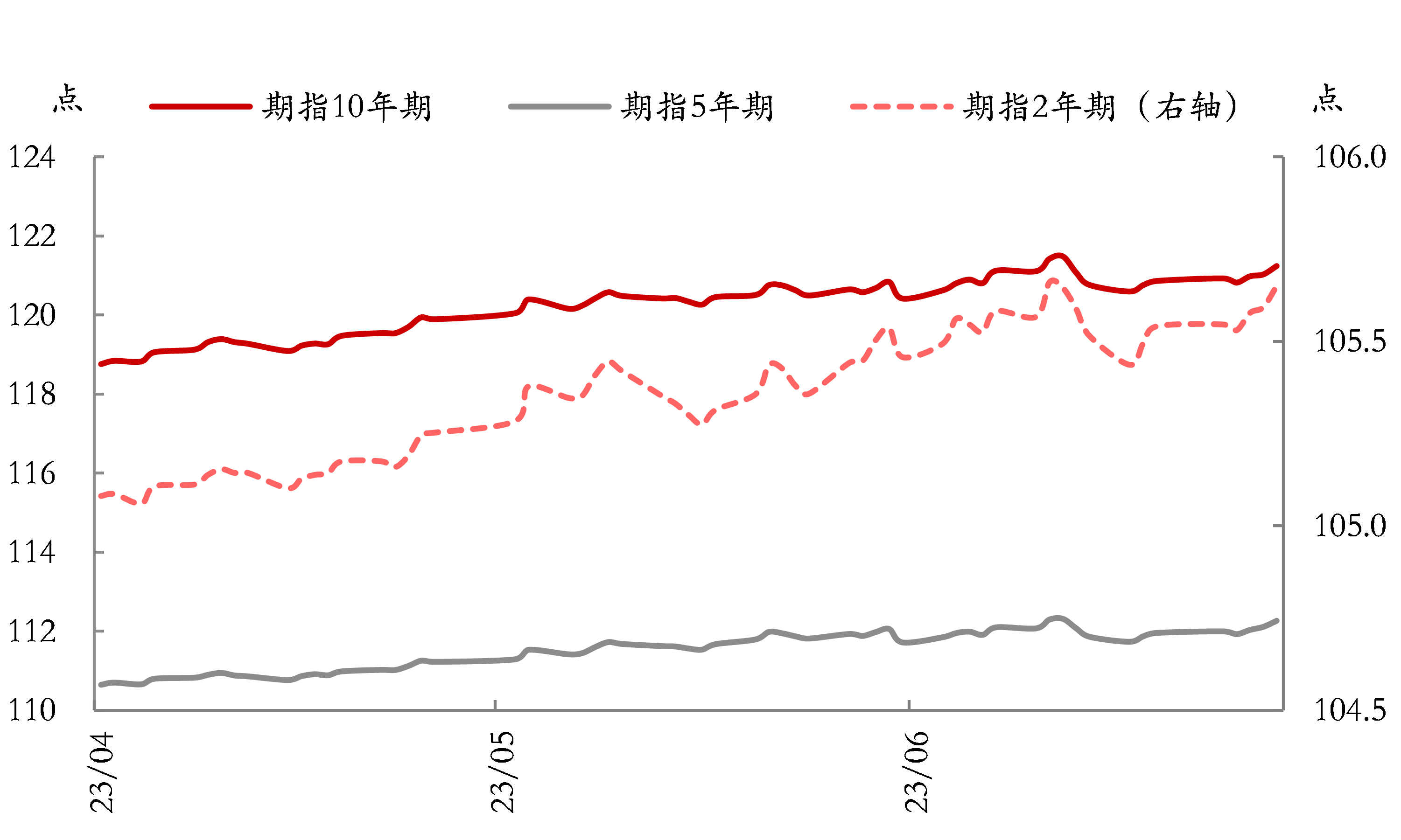 2023年4月12日,中证商品指数公司正式发布中国国债期货收益指数10年期(简称期指10年期)、中国国债期货收益指数5年期(简称期指5年期)和中国国债期货收益指数2年期(简称期指2年期)三条指数。上市以来,三条指数走势相关性较强,二季度运行较为平稳,呈现出由上涨转为振荡态势。