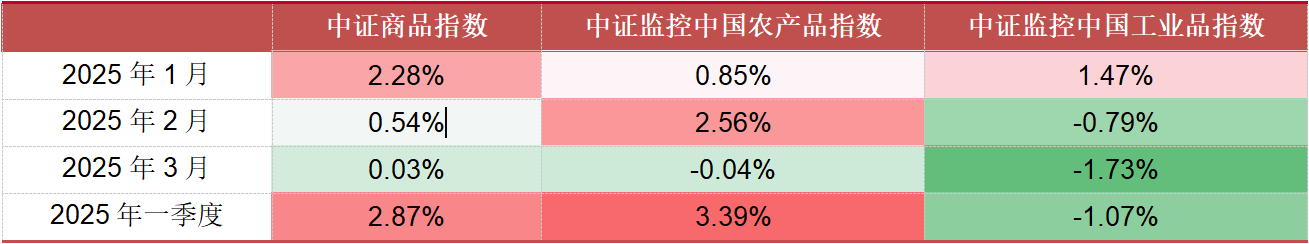 2025年一季度,大宗商品市场整体震荡上涨,内部板块有所分化。从指数表现来看,中证商品期货指数上涨2.87%,中证监控中国农产品期货指数上涨3.39%,中证监控中国工业品期货指数下跌1.07%。