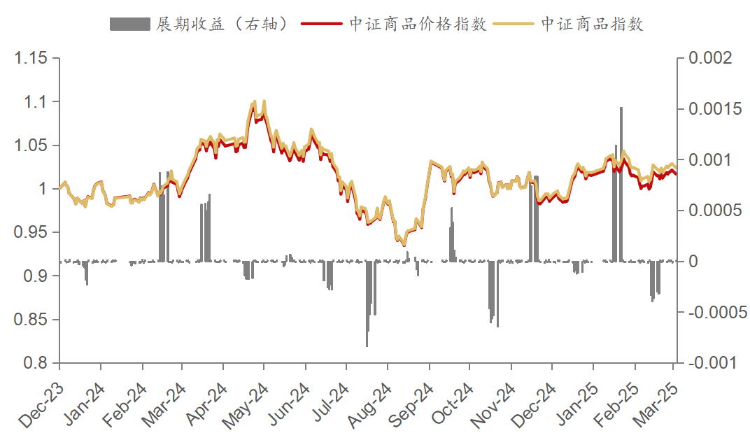 2025年一季度,中证商品指数每个月的展期收益贡献差异较大,主要源于指数在编制时基于表征性原则充分参考了品种的换月逻辑,因此每个月换月时实际发生展期的品种范围有所差异。