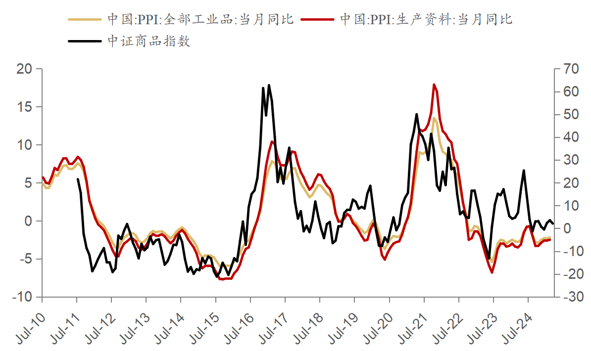 作为综合性指数,中证商品指数在反映宏观经济尤其是通胀方面能够发挥重要参考作用,其同比序列与PPI同比有着高度相关性并且能够领先约2个月。一季度,中证商品指数同比序列震荡上行,表明PPI同比正在稳步修复,但依然面临一定压力。