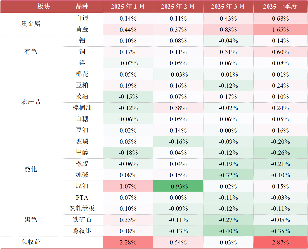 2025年一季度,贵金属、有色和农产品多为正收益,而能化和黑色多为负收益,商品内部的分化主要源于国内经济转型和产业升级。其中,贵金属保持强势,主要驱动为全球对美元信用的担忧。