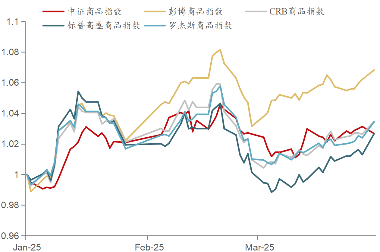 1月,在政策和需求恢复的强预期牵引下,工业品和农产品保持强势,对需求端敏感性更强的工业品涨幅更大。2月工业品和农产品走势分化明显,由于美洲产区天气扰动,油脂油料板块保持强势并带动农产品指数大幅走高;由于年后复工复产不及预期,工业品指数回调。3月,农产品板块虽有关税扰动,但供应端未发生显著边际变化,整体保持震荡偏弱格局;工业品板块,虽然国内政策和欧洲财政发力预期升温,但现实需求较弱的黑色和能化占比更大,工业品指数仍然保持弱势。