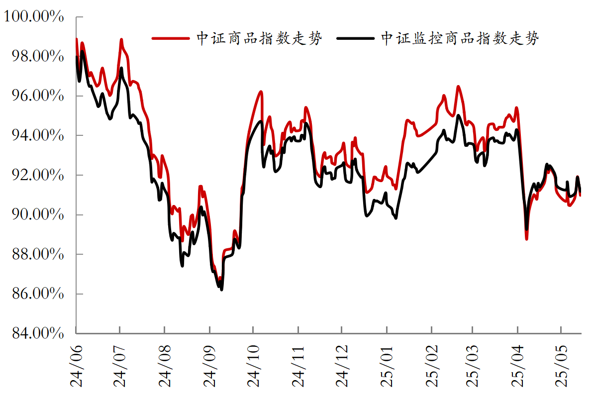 5月中旬,随着中美日内瓦经贸协议达成,关税政策阶段性缓和,大宗商品市场情绪好转,交易逻辑重回基本面驱动。5月中证商品指数系列走势企稳,有效地反映了全球市场风险偏好、国内中观产业逻辑和微观板块驱动对商品价格的影响。