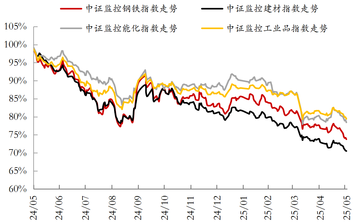 总体来看,5月,中证商品指数与中证监控商品指数震荡下行。5月,中证商品指数月度收益率为-1.56%,年化波动率为6.84%,于5月14日达到月内最高值1909.66点,或源于中美日内瓦经贸协议达成对风险偏好的提振;于5月30日达到月内最低值1849.83点,或源于供需错配压力对工业品估值的压制。