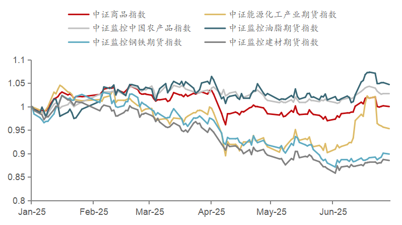 从中证商品期货指数(下称中证商品指数)和两个板块指数——中证监控中国工业品期货指数和中证监控中国农产品期货指数来看,2025年上半年商品市场呈现窄幅震荡态势。年度来看,中证商品指数微涨0.20%,振幅为10.27%。具体来说,中证商品指数开年强势上冲后回落整理,4月初跳空大幅下跌后触底反弹,随后展开一个月左右的震荡偏弱走势,6月强势上冲修复前期跳空缺口后再次回落。