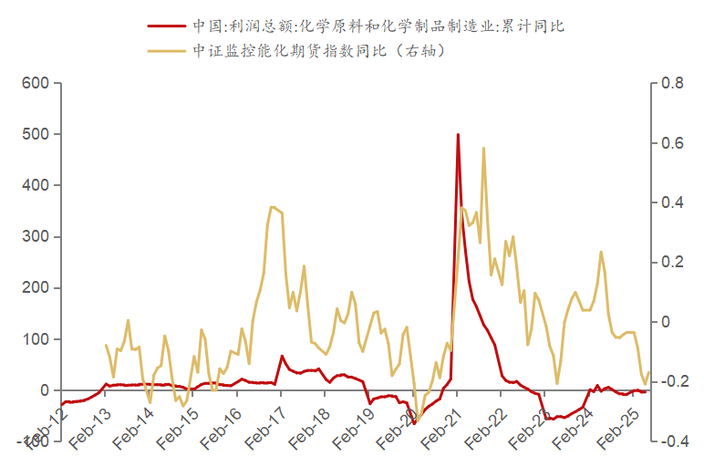图为中证监控能化期货指数同比与对应行业利润总额