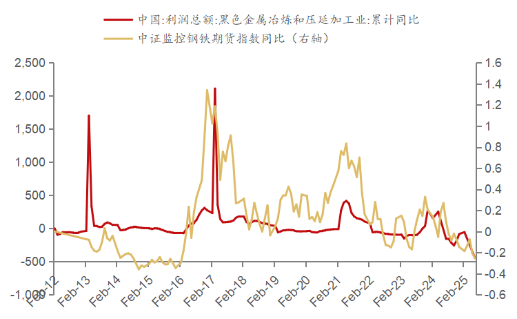 图为中证监控钢铁期货指数同比与对应行业利润总额