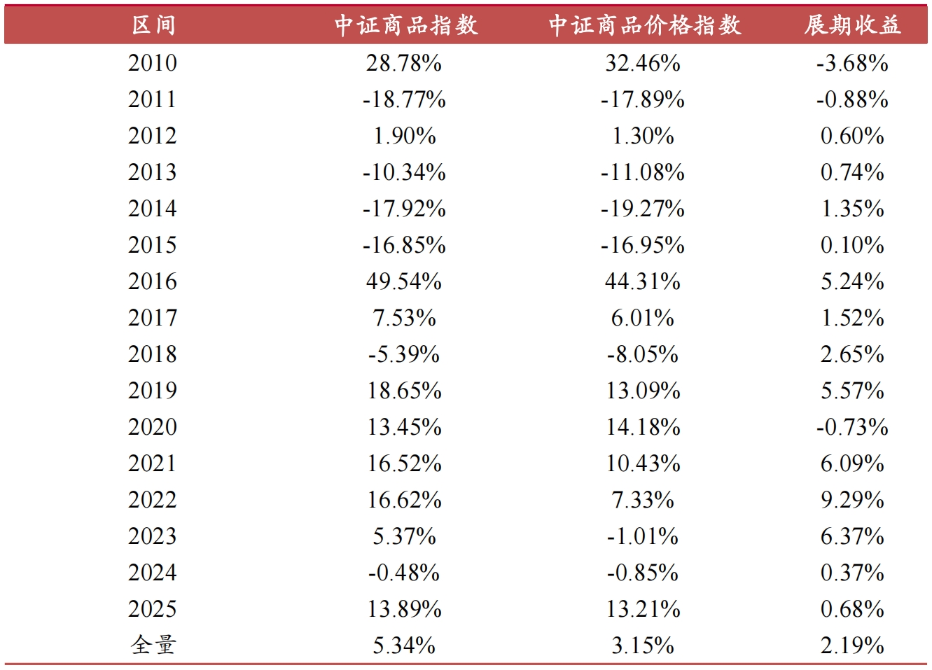 表为中证商品指数历年区间收益和展期收益
