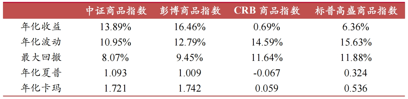 表为中外商品指数历史全量收益风险指标