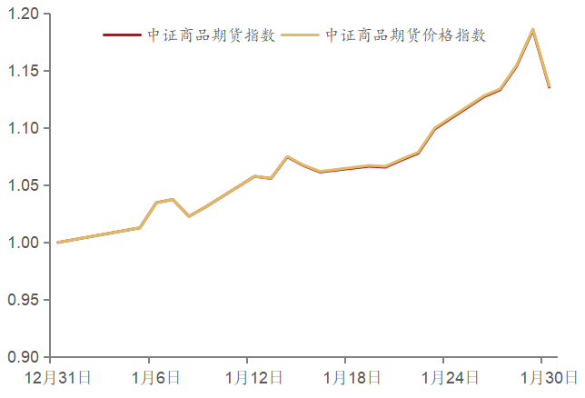 1月,中证商品期货指数上涨13.57%,中证商品期货价格指数上涨 13.64%。整体来说,1月商品指数呈现出强势上涨的特征,全月震荡幅度达到 19.71%,两大指数同步走高且波动幅度显著,彰显商品市场整体强势运行格局。