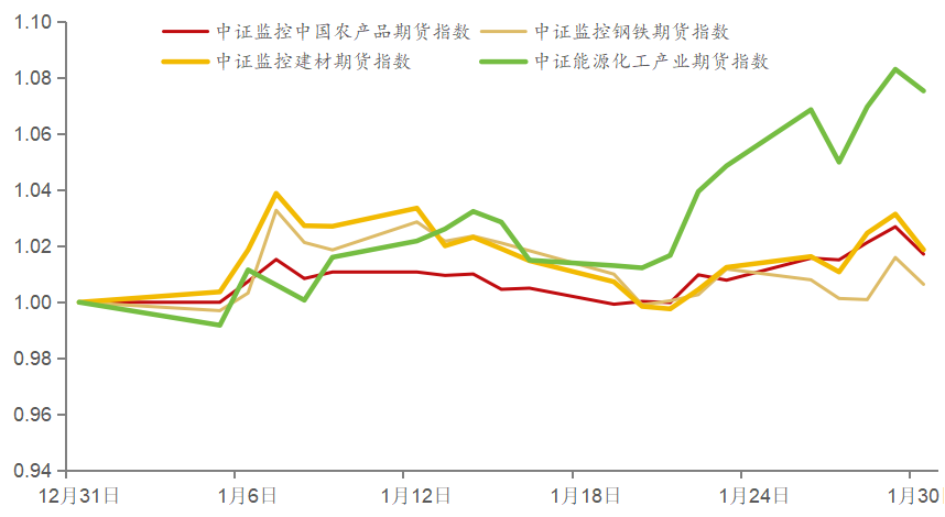 1 月商品消费即将进入春节备货旺季,各板块品种更多围绕自身供需现实与预期展开博弈。1月,除中证能源化工产业期货指数外,多数板块指数呈现先上涨再下跌然而进入震荡区间的走势,其中中证能源化工产业期货指数上涨 7.54%,中证监控中国农产品指数上涨 1.72%,中证监控钢铁期货指数上涨 0.64%,中证监控建材期货指数上涨1.87%。