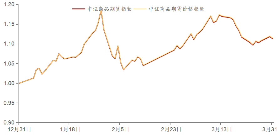 一季度中证商品期货指数与价格指数走势高度同步,整体呈现高开后震荡抬升格局。1月在全球财政货币政策共同发力、局部地缘风险释放的共振背景下,有色贵金属价格大幅上行;2月则受沃什被提名下任美联储主席的影响,有色贵金属价格整体大幅回落,随着地缘局势风险发酵,原油价格温和上涨;3月随着美以伊冲突事件推进,能化板块带领指数上行,整个季度波动明显加大。