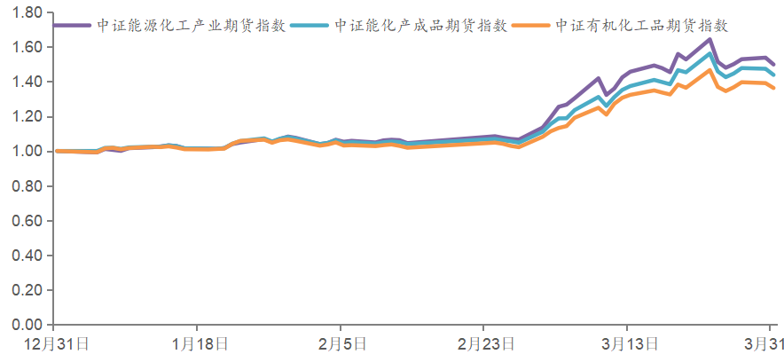 一季度能化板块成为全市场最强主线,三大指数涨幅领跑全市场:中证能源化工产业期货指数大涨49.89%,中证能化产成品期货指数大涨43.89%,中证有机化工品期货指数大涨36.32%。
