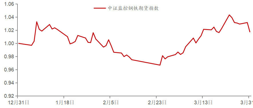 一季度中证监控钢铁期货指数上涨1.75%,呈现区间震荡格局:1月随商品整体情绪与基建预期而略偏强,2月则受春节停工、累库压力影响回调,3月在能源价格带动以及工地逐步复工等的带动下走势偏强。