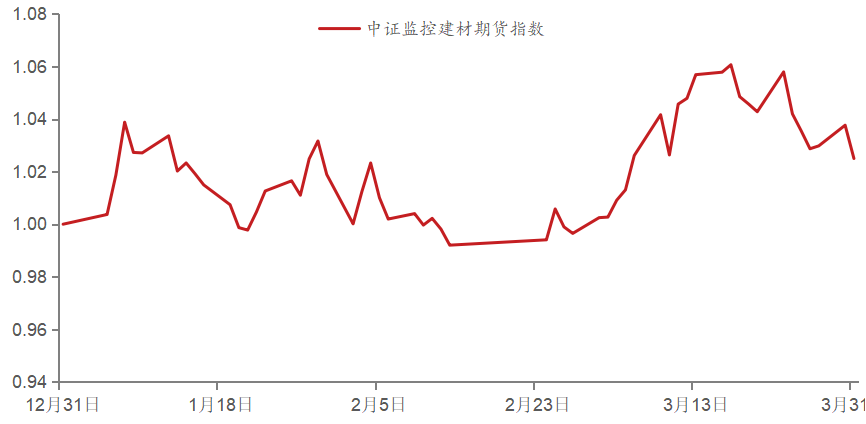 一季度中证监控建材期货指数上涨2.5%,走势先抑后扬。1月受政策预期带动抬升,2月因地产竣工偏弱、项目停工进入季节性调整,3月在“金三”旺季预期下有所企稳,但主要还是受成本推升的影响而走强。