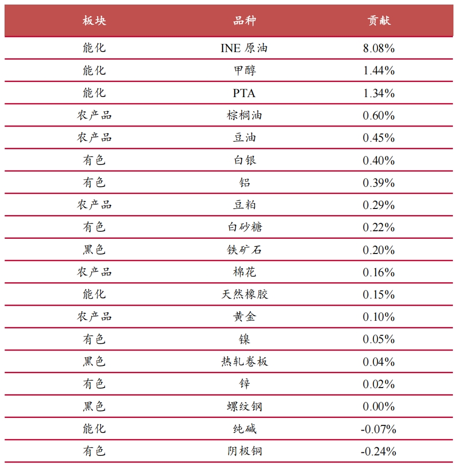 能化板块为核心驱动力量。由于占比大、涨幅高,INE原油以8.08%的收益贡献遥遥领先,甲醇、PTA等品种同步发力,核心因素依旧是美以伊冲突导致的霍尔木兹海峡通行量骤降。