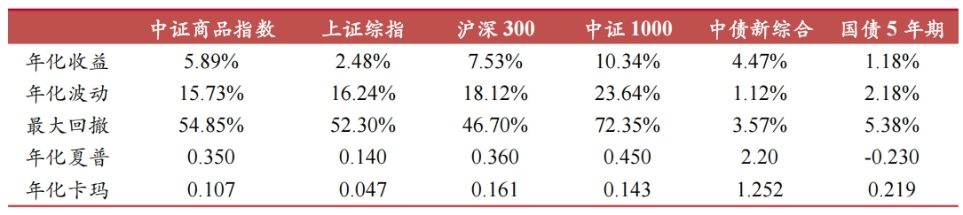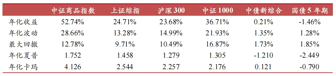 从收益风险指标看,一季度中证商品指数年化收益52.74%,年化波动28.66%,最大回撤12.78%,风险收益特征介于股票与债券之间,保持“高收益、高波动”的特征,相较中证1000来说有明显的优势。