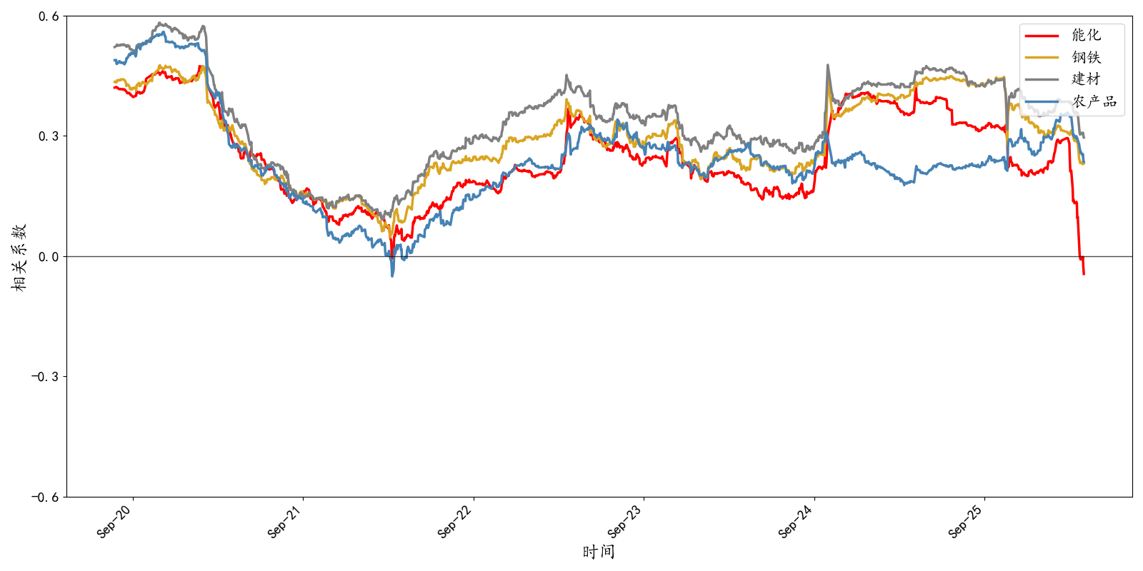 近期能化与沪深300的相关度明显下降,源于从过往的需求侧逻辑转向了供给逻辑。能化不仅和有色贵金属有跷跷板效应,与沪深300也存在跷跷板效应,核心原因依旧是流动性的抽离和避险情绪。钢铁、建材与房地产产业链的绑定较深。近年来房地产市场的深度调整,使其需求逻辑与更广泛的宏观经济出现差异,导致其与沪深300的相关性也较低。